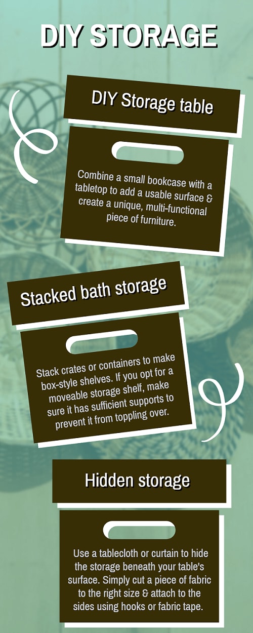 Another table idea involves using a tablecloth or curtain to hide the storage beneath your table's surface. Simply cut a piece of your chosen fabric to the right size, and attach to the sides using hooks or fabric tape. You can also use fabric tape to make a simple, no-sew hem for a more refined aesthetic.