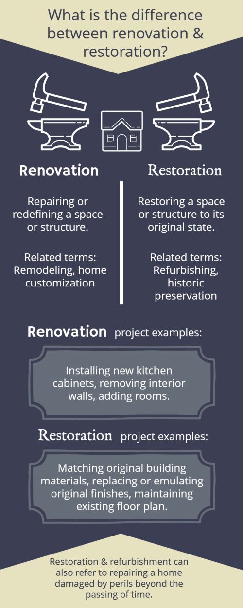 In the real estate world, the terms renovation and restoration are often used interchangeably. The words are so similar, it’s easy to assume they mean the same thing. However, there are some important differences to be aware of. Here is a quick guide to understanding these terms: