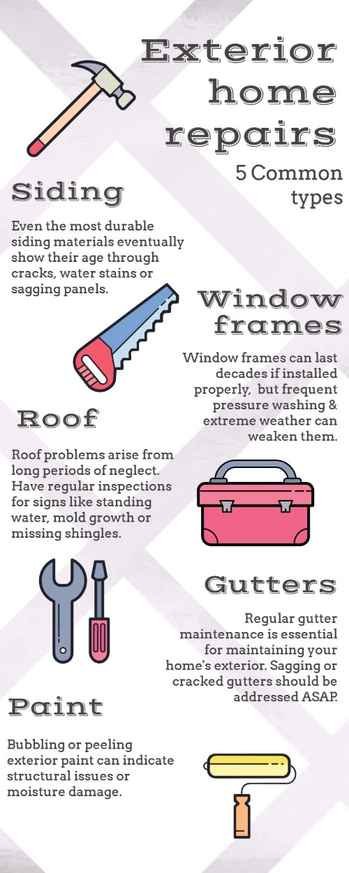 There are many exterior home repairs you may have to handle as a homeowner. While many are best addressed by home improvement professionals, many common issues can be identified early to prevent major damage.